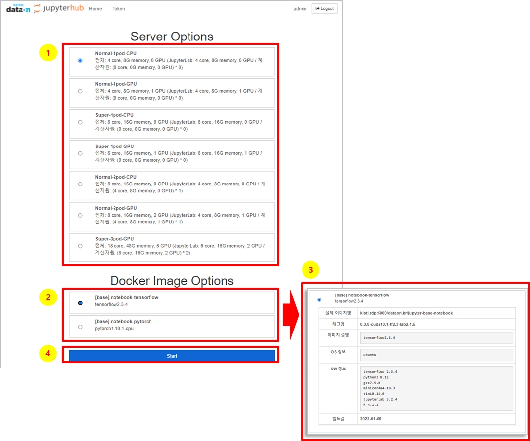 - ④Start 버튼 : 선택된 Server Options와 Docker Image Options 정보를 바탕으로 JupyterLab 실행.
