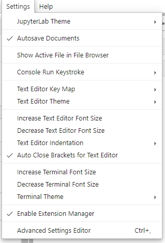 - Running Terminals and Kernels: 현재 JupyterLab에서 구동 중인 Terminal 또는 Kernel를 표시하며, 해당 화면에서 바로 shut down 이 가능합니다.