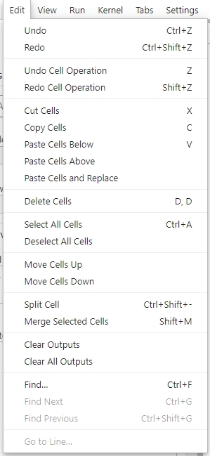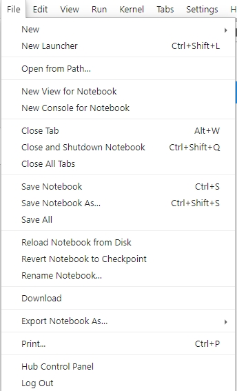 - ① Menu Bar: 상단 메뉴 모음에는 JupyterLab에서 사용할 수 있는 작업 제공됩니다.