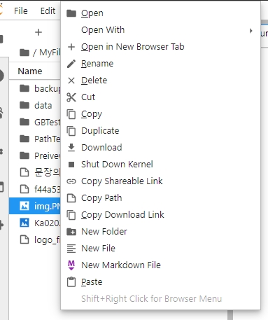 - File Browser: 파일 탐색기로, DataON, CANVAS와 동일하게 사용자의 MyDrive와 동일한 화면이 제공됩니다.