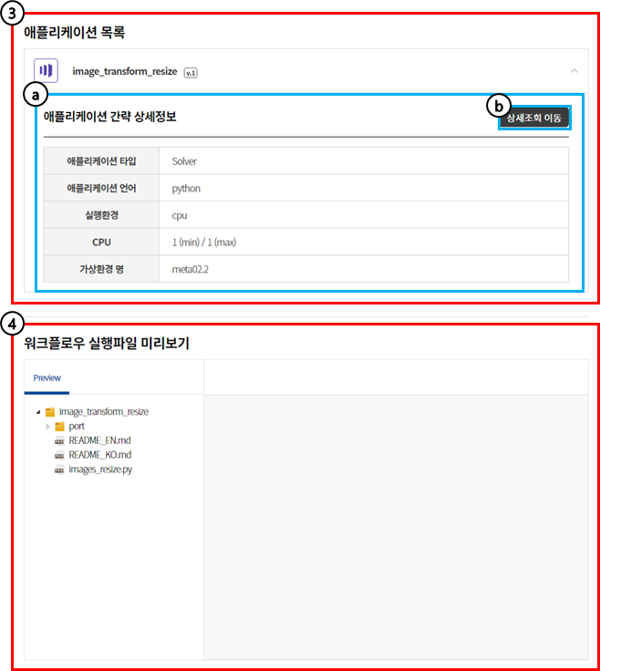 워크플로우 실행에 필요한 ⓐCPU/GPU 실행환경 정보를 확인할 수 있습니다.