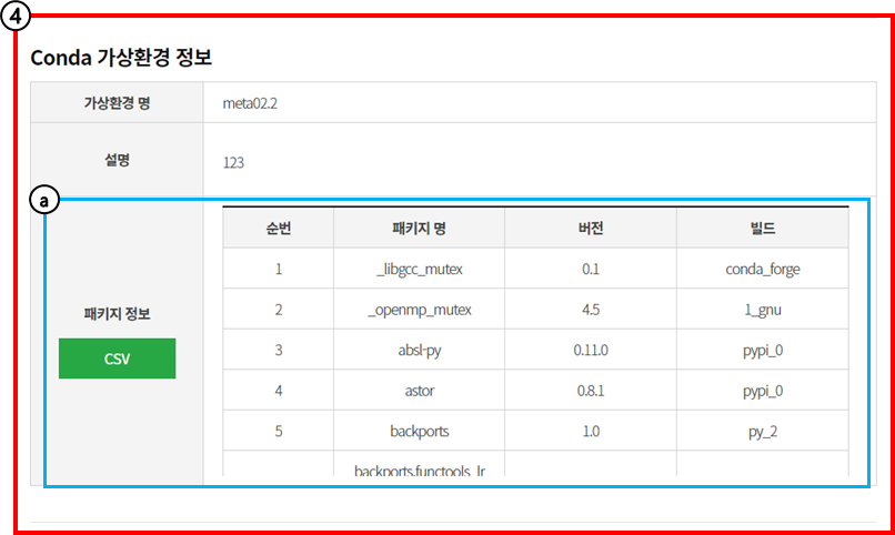 가상환경의 이름과 설명, ⓐ패키지 정보를 확인할 수 있습니다.