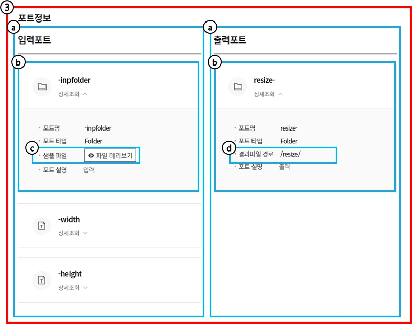 출력 포트의 경우, 결과 파일이 저장될 ⓑ경로 정보를 함께 제공합니다.