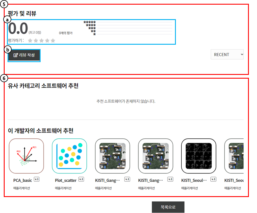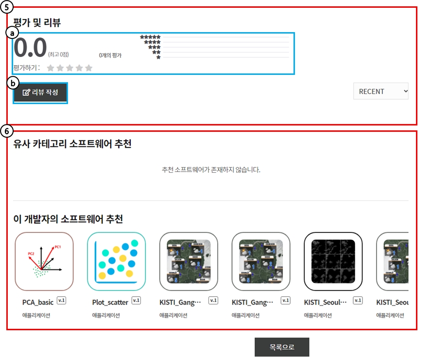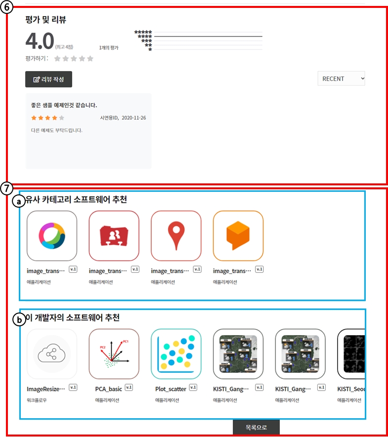 상세정보 화면에서는 애플리케이션의 ①기본 정보, ②실행 정보, ③포트 정보, ④Conda 가상환경 정보, ⑤애플리케이션 실행 파일 정보, ⑥평가 및 리뷰 정보, ⑦소프트웨어 추천 정보를 제공합니다.
