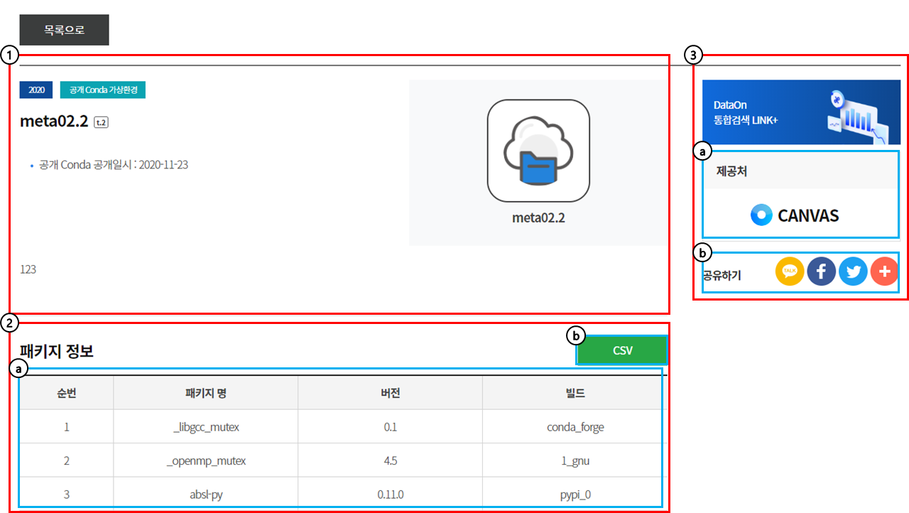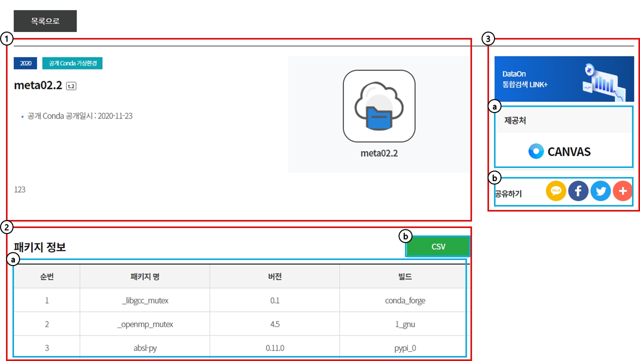 공개 Conda 가상환경 ①이름, 공개 일자, 설명 정보를 확인할 수 있습니다.