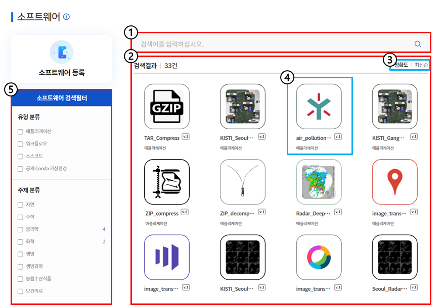 검색 결과 화면 좌측의 ⑤검색 필터를 사용하여 좀 더 정확하게 원하는 소프트웨어를 검색할 수 있습니다.