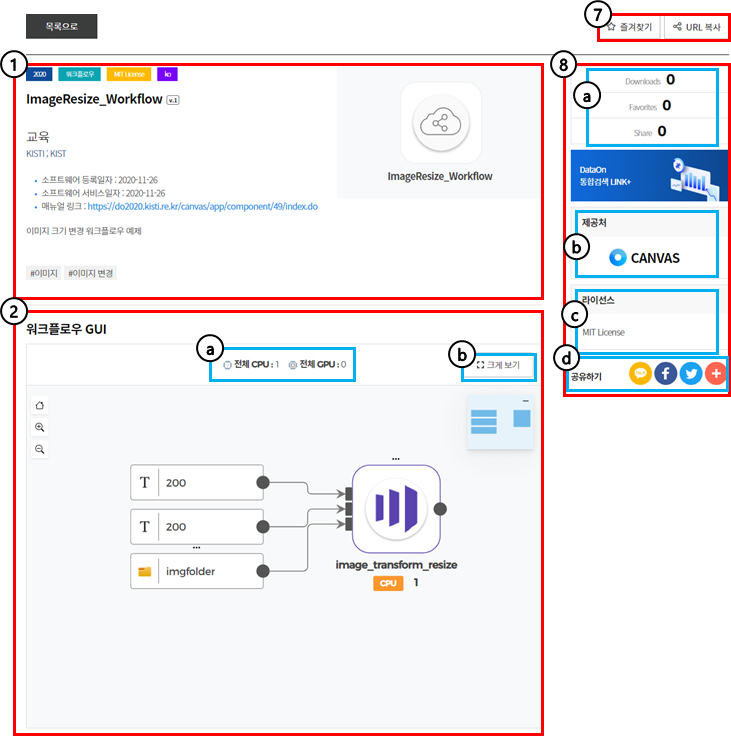 ⑧상세정보 화면 우측에서는 해당 워크플로우의 ⓐ다운로드 수, 공유 수, 좋아요 수 정보와 ⓑ제공처, ⓒ라이선스 정보를 제공합니다.