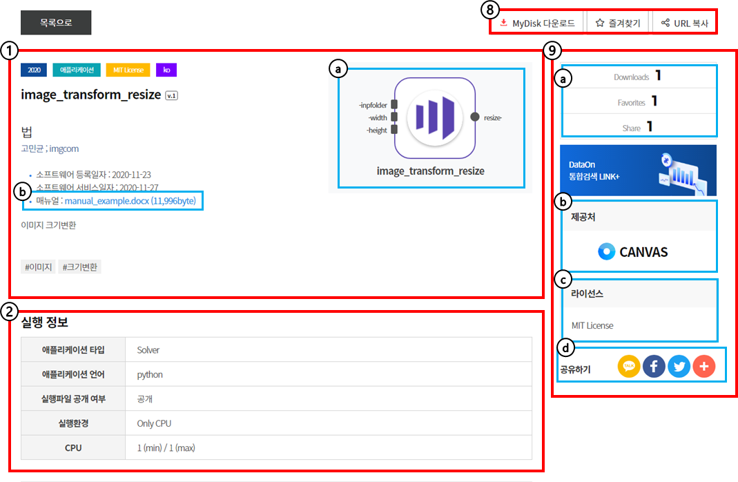 ⑨상세정보 화면 우측에서는 해당 애플리케이션의 ⓐ다운로드 수, 공유 수, 좋아요수 정보와 ⓑ제공처, ⓒ라이선스 정보를 제공합니다.