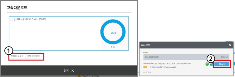 "① 다운로드"버튼을 클릭하신 후 " ②Start" 버튼을 클릭하셔야 다운로드가 진행됩니다.