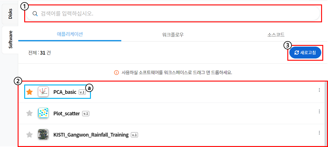 소프트웨어 목록 상단의 ①검색창을 이용하여 원하는 소프트웨어를 검색할 수 있습니다.