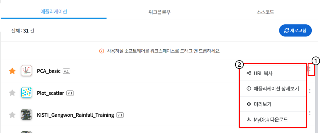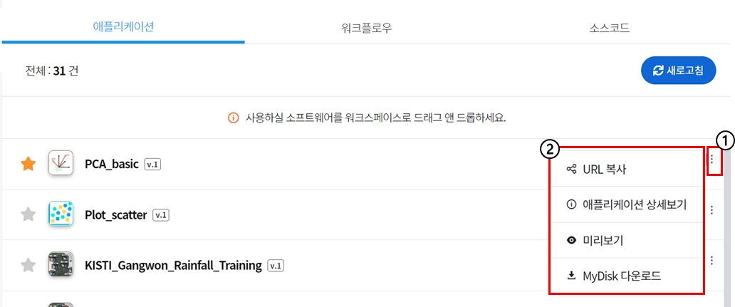 "애플리케이션 상세보기" : 새창으로 해당 애플리케이션의 상세정보 화면으로 이동합니다.