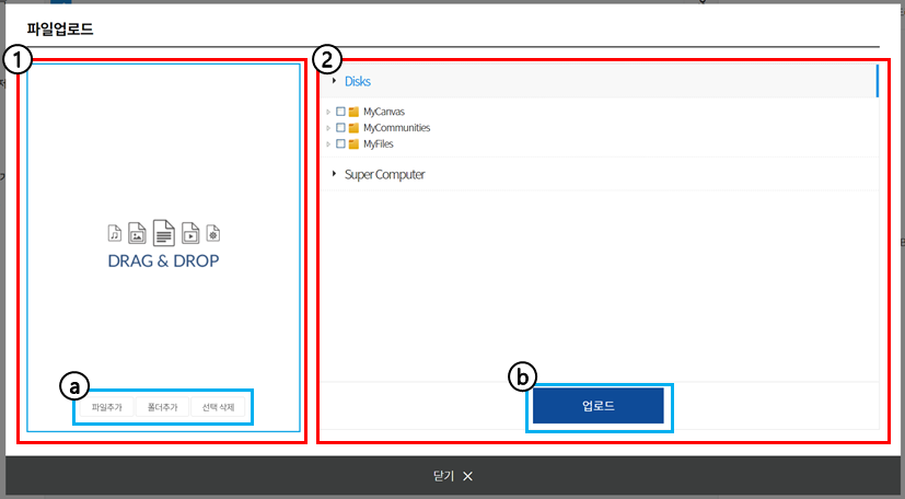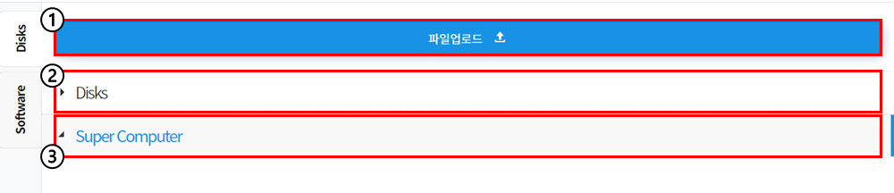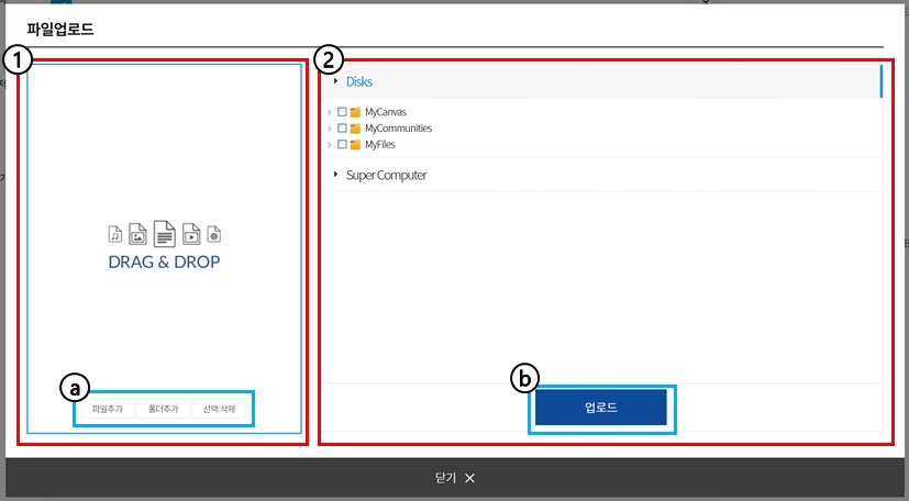 ②Disks(마이 드라이브) 내의 폴더 또는 Super Computer 내의 폴더 중 해당 파일을 업로드할 위치를 선택한 뒤, 하단의 "ⓑ업로드" 버튼을 클릭하면 해당 파일이 선택한 위치에 업로드됩니다.
