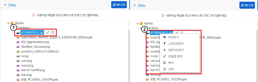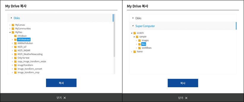 "복사" : 해당 파일을 복사하여 Disks 또는 슈퍼컴퓨터에서 지정한 폴더에 저장합니다.
