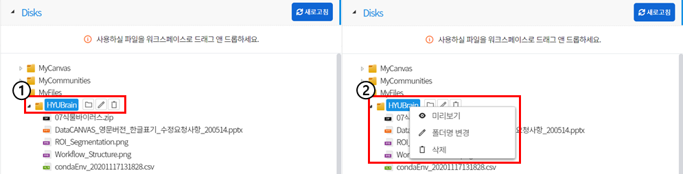 "①폴더" 클릭 시 우측 메뉴가 활성화 됩니다.