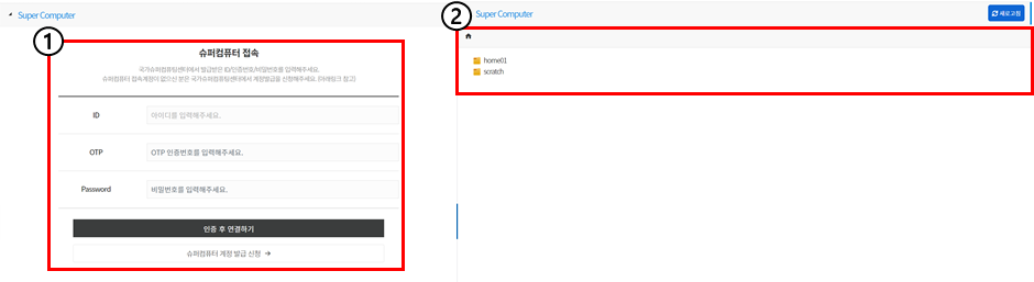 ① 슈퍼컴퓨터 인증을 진행한 뒤 ②슈퍼컴퓨터 서비스를 사용하실 수 있습니다.