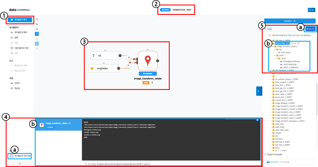 제작한 워크플로우를 "①워크플로우 실행" 버튼을 클릭하여 워크플로우를 수행합니다.