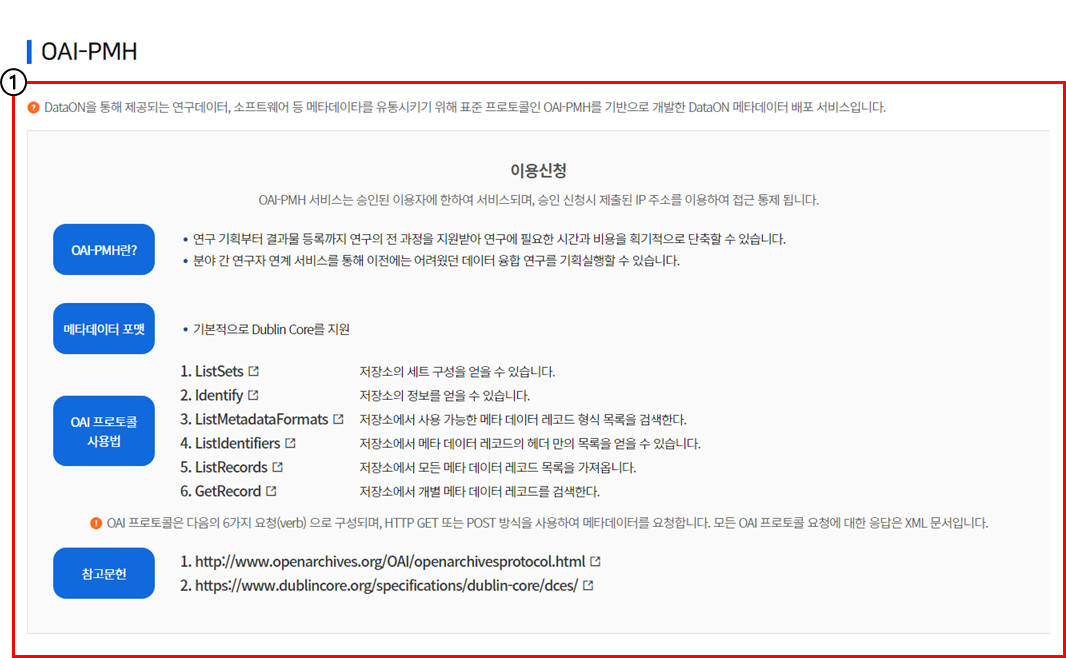 공유 서비스 목록 화면 상단에서 OAI-PMH 공유 서비스에 대한 ①설명을 확인할 수 있습니다.